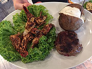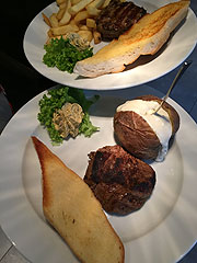 Die Betonung liegt wie auch schon in der Leopoldstraße auf natürlichen Werkstoffen, die eine Verbindung zum Naturprodukt Fleisch vermitteln. Holz, naturfarbenes Nappa-Leder und Metall, teils mit ausgeschnittenen zum Thema passenden Motiven wie Stieren, bestimmen die ungewohnte Optik. In dem neuen Asado-Betrieb am Maximiliansstraße dominieren offene Räume , Tische mit massiven, Holzplatten, und Deckenverkleidungen in Kombination mit verwittertem Holz, die man noch aus den Vorgängerlokalen weiterverwenden konnte. Kriterien wie Natürlichkeit und Authentizität sind aber auch an vielen im Gesamteindruck stimmigen Details sichtbar: schnörkellose Konstruktion; für die Gäste sichtbar gemachte Verbindungen im Material, Podeste, um Ebenen zu schaffen, etc. Transparent ist das neue Asado. Gleich von 3 Seiten übers Eck gibt es hohe Fensterfronten. Zum Maximiliansplatz hin gibt es eine Sonnenbeschirmten Terrasse, die offen und einladend wirkt. Aber ansonsten ist natürlich Steak, Steak und Steak hier im Mittelpunkt der Speisekarte. Die mit Salaten beginnt: der Blackend Salad ist eine Spezialität aus den Südstaaten, basierend auf Steak in Streifen, der Caesar Turkey Salad ist ein um Putenbrust-Streifen ergänzter Caesar Salad, den es ohne Pute natürlich auch auf der Speisekarte gilt, Tuna Salat, Scampi Salat und andere Salate. Vorspeisen wie Maiskolben vom Grill, Chicken Wings, Carpaccio vom Rind, Potatoes mit verschiedenen Füllungen, Giant Burgers (Jalapenos Burger, Bacon Burger, Caesar Burger) Weiter geht es mit den Asado Klassikern gewidmet: Huftsteak, Filetsteak oder Rumpsteak gibt es in jeweils zwei verschiedenen Größen, immer begleitet von buntgemischtem Salat, Baked Potatoe mit Sourcrea, frisch geröstete Asado-Brot und zart schmelzender Kräutercreme. Specials wie "Steak & Prawns" Surf'n'Turf, Rib-Eye-Steak, Pfeffersteak ider Grillplatten ergänzen die Karte. Ein besonderes Highlight ist der Mittwoch, wenn Spareribs-Essen angesagt ist. Das "Spare Ribs no Limit" für 9,99 € am Abend begeistert so viele, daß sich eine Tischreservierung lohnt. Der menschliche Gast labt sich derweil an was Süffigerem. Da können Sie gleich einmal das Mühlfelder natürtrüb aus eigener Brauerei probieren. Eine Besonderheit in diesem Asado ist sicherlich die Sushibar, die hier wie ein Shop-in-Shop ins Asado integriert wurde, dort gibt es neben Appetizern wie "Edamane" (gekochten Sojabohnen, gesalzen), Wakame Gomaac (grüner Seealgen Salat) oder Oyazuke (Octopus, Gurke, Rettich, pikant) diverse Sushi-Menüs, darunter auch ein vegetanisches Menü. PS: Das südamerikanische Rindfleisch wird übrigens in der eigenen Metzgerei in München verarbeitet. Ebenfalls in München befindet sich die zugehörige Konditorei, denn auch alle Desserts werden selbst hergestellt. Asado Steak (geschlossen) Es gibt aktuell (2021) nur noch in Asado Steak Restaurant in München-Laim, dort in der Landsberger Straße 290