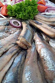 Im Mutterland des Nieuwe Haring, wie er hier genannt wird, ist Matjes geradezu ein Kult: Alles trifft sich und feiert fröhlich den Saisonauftakt. Das erste Fass der begehrten Heringsspezialität aus der Nordsee wird jedes Jahr auf der Fischauktion in Scheveningen traditionell für einen guten Zweck versteigert, und die Königin bekommt stets die feinsten Exemplare zum Kosten serviert. 28.000 € brachte 2004 das "erst beste Fass" ein. Zur offiziellen Eröffnung der Matjes-Saison durch Kornelius Spaans, Generalkonsul der Niederlanden in München und Volker Reeh, Vorsitzender des Bayerischen Einzelhandesl/Fachabteilung Fische traf man sich am 16. Juni 2004 auf Münchens Viktualienmarkt zu einer Matjes Verkostung bei den dort ansässigen Münchner Fischhändlern. Starkoch Alfons Schubeck ("Südtiroler Stubn" am Platzl) und Schauspieler Elmar Wepper zauberten Matjes-Phantasien, holländische Mädchen verschenkten Gutscheine für frische Matjes-Filets, dazu spielte fröhliche Dixie Musik und sogar die Wolken rissen auf. Was hat es mit dem Matjes an sich? Nur in Holland hergestellter Matjeshering darf als solcher bezeichnet werden. Heringe, die zu Matjes verarbeitet werden, müssen gewisse Kriterien erfüllen: Sie dürfen noch keinerlei Rogen oder Milch gebildet, sprich noch nicht gelaicht haben, und müssen gleichzeitig das wertvolle Fett im Filet aufweisen samt weicher Konsistenz und zartem, arteigenem Aroma. Eben dieses genussversprechende Stadium erreichen die Fische im Frühjahr: Wenn die Sonne das Meer erwärmt, ziehen die Heringe in großen Schwärmen aus dem kalten, tiefen Meer in seichtere Gewässer um. Dort finden sie reichlich Plankton vor, mit dessen Hilfe sie ordentlich an Gewicht zulegen, um sich für die Fortpflanzung zu stärken. Ab Mai, spätestens Juni bis in den Juli hinein haben die Fänge dann die gewünschte, feine Qualität. Bevor aus dem Hering ein Matjes wird, wird die Rohware gekehlt, schockgefrostet, in Salzlösung gegart, dann filetiert und in der Regel als Doppelfilet in den Handel gebracht. Beim Kehlen wird der Fisch so ausgenommen, dass noch ein Teil der Bauchspeicheldrüse erhalten bleibt. Deren Enzym lässt den Fisch dann gemeinsam mit Salz zum verzehrsfertigen Matjes reifen. 600 Jahre ist es her, daß der erfahrene niederländische Fischer Jan Pieter Beukelzoon diesen Trick erfand. Und noch immer sind Spezialisten in Handarbeit am Werk, wenn es ums "Kehlen" geht. Holländischer Matjes enthält zwei bis maximal drei Prozent Salz. Dank seines angenehm milden Geschmacks muss der Leichtsalz-Matjes nicht extra gewässert werden - im Gegensatz zum Salzhering, der oft hartgesalzen wird und dann mindestens 20 Prozent Salz im Fischgewebewasser aufweist. Aufgrund der milden Salzung sollte Matjes bald gegessen werden - ohnehin schmeckt er am besten an dem Tag, an dem man ihn gekauft hat. Ein guter Matjes ist daran zu erkennen, dass er nicht zu groß, zart rosa, mild gesalzen und schön fett ist. In der Regel enthält er einen Fettanteil von 15 bis 20 Prozent, vorgeschrieben sind mindestens 12 Prozent. Und da es sich dabei vor allem um ungesättigte Fettsäuren handelt, gilt die beliebte Delikatesse als ebenso lecker wie ernährungsphysiologisch wertvoll. Original Matjes ist nicht zu verwechseln mit Heringen nach Matjesart, dessen Filet weniger Fett enthalten darf. Quelle Produktinformationen: u.a. Nestlé Deutschland AG |
