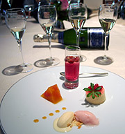 ![]() Küchenchef Mario Corti (li:) präsentiert ein 6-gängiges Champagner Menü ![]() Roh marinierte Langostinos mit Limettencreme und Kaviar ![]() Loup de Mer an jungem Spinat, Artischocken und orientalischer Würze ![]() Perlhuhnsupreme auf getrüffelten Steinpilzen und Kerbelpapardelle ![]() Delice von Champagner Laurent Perier ![]() Dazu: besondere Cuvée Champagner, u.a. 1996 Laurent Perrier Brut Millésime, Laurent Perrier Grand Siècle oder den Laurent Perrier Demi Sec ©Fotos: Martin Schmitz |