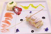 Frau Sopp vom Weingut Schloss Sommerhausen (www.sommerhausen.com) stellte die zu jedem Gang korrespondierenden Weine vor. Das Weingut umfaßt etwa 29 Hektar Weinberge, die mit den klassischen Rebsorten Silvaner, Riesling, Grauer Burgunder und Weißer Burgunder bestockt sind. Als Spezialitäten werden dort Rieslaner, Frühburgunder, Chardonnay und Auxerrois angebaut. Versuche zur Qualitätsverbesserung der Rebsorten werden auch heute noch in der von Johann Kaspar Steinmann gegründeten Rebschule Steinmann durchgeführt. In den Hang- und Steillagen bei Sommerhausen, Eibelstadt, Randersacker und Iphofen wachsen die Weine auf Muschelkalk und Keuper daß deshalb viel von Hand gearbeitet wird auf den Weinfeldern, versteht sich von selbst. Auf den Tisch kamen