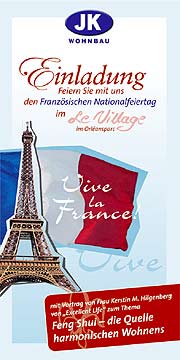 Feng Shui im Französischen Viertel Haidhausens im Rahmen eines Events anlässlich des Französischen Nationalfeiertages können sich Interessierte über „Die Quelle harmonischen Wohnens“ informieren. Passend zum französischen Namen des Wohnensembles „Le Village“ feiert die J.K. Wohnbau den 14. Juli mit einem großen Fest. Dort, wo schon bald der Grundstein gelegt wird, können sich Interessenten und Besucher ab 18.00 Uhr in aller Ruhe über das Bauvorhaben informieren. Um 18.30 Uhr wird die Feng Shui-Expertin Kerstin M. Hilgenberg einen Vortrag mit dem Titel „Feng Shui die Quelle harmonischen Wohnens: vom Grundstück bis zur Inneneinrichtung“ halten. Eine Vielzahl von Maßnahmen aus dieser jahrtausende alten Lehre finden sich im „Le Village“ wieder und sorgen für Lebensfreude und Wohlbefinden bei den zukünftigen Bewohnern. Im Anschluss sorgen kulinarische und musikalische Spezialitäten aus Frankreich für beste Stimmung. Als Höhepunkt des Abends unterhält „Mireille“ die Gäste der J.K. Wohnbau am französischen Nationalfeiertag. Mit dieser Veranstaltung bedankt sich die J.K. Wohnbau gleichzeitig bei den Anwohnern rund um das Gelände für das Verständnis, dass die Verschönerung des Viertels nicht ohne Staub und Lärm von statten geht. Alle Anwohner waren daher ebenfalls herzlich eingeladen, am 14. Juli 2005 im „Le Village“ mitzufeiern. Ausführliche Informationen zu den Wohnungen im „Le Village“ gibt es vor Ort, Kirchenstraße 78 d, sowie im Internet unter www.JKWohnbau.de Das Verkaufsbüro der J.K. Wohnbau ist Montag bis Freitag von 17 bis 19 Uhr sowie an den Wochenenden und Feiertage von 14 bis 18 Uhr geöffnet. 05.02.2006, Sonntag - FENG SHUI wird zum zentralen Thema im Bauvorhaben „Le Village“ in München-Haidhausen (mehr) |