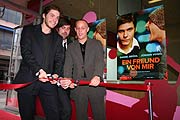 X FILME und X VERLEIH luden am 22.10.2006 schon am Vormittag dazu ein ein,über die Premieren in München, Berlin, Hamburg, Düsseldorf und Köln zu berichten. Zwei der erfolgreichsten deutschen Filmstars machten sich an diesem Tag daran, ins "Guinness World Records Buch" aufgenommen zu werden. Daniel Brühl und Jürgen Vogel und Regisseur Sebastian Schipper wollen den von Hollywood-Star Will Smith aufgestellten Rekord über die "meisten Premierenauftritte" brechen. Der amerikanische Titelverteidiger hatte in England drei Kino-Premieren binnen zwölf Stunden besucht. Der angestrebte neue Rekord soll diese Anzahl verdoppeln! In München startete die Premierentour auf dem roten Teppich im mathäser. Im Vergleich zu den anderen Städte, an denen die Premiere am Mittag, nachmittag oder sogar Premierenfreundlich am Abend stattfinden wird, hielt sich die Anzahl der Neugierigen und auch Special-Premierengäste in überschaubarem Rahmen. Hier sah man dann z.B. auch X-Verleih Vorstand Anatol Nitschke auf dem roten Teppich, der von München aus gleich nach Hamburg weiterflog, alle Städte konnte er heute nicht mitmachen. Da zog neben den Hauptdarstellern wenigstens noch die im schwarzen X-Verleih Porsche ankutschierte Davorka Tovilo mit einem knappen "mach ich mir nen Schlitz ins Kleid" Schottenröckchen die Blicke der Kameras und Fernsehteams auf. In Düsseldorf erwartet die dortigen Gäste sogar der Bürgermeister, doch dort findet die Premiere auch erst später am Tag statt und die Gästeliste ist am Rhein ansonsten fast noch kürzer als in München. So richtig voll auf den roten Teppichen dürfte dann die Premierentour in Berlin werden, dort gibt es gleich 2 Premieren, und später vor allem in Köln, wo die Rekordtour am Abend nach der Premiere im dortigen Cinedom mit einer großen Premierenparty enden wird Worum geht es im Film? Unterschiedlicher könnten Karl (Daniel Brühl) und Hans (Jürgen Vogel) nicht sein: Karl ist ein junger Mathematiker, der erfolgreich in einer Versicherung arbeitet, der Lebenskünstler Hans hält sich mit Aushilfsjobs über Wasser. „Bist du glücklich?“, fragt Hans bei ihrer ersten Begegnung. Aber Karl weiß keine Antwort, bis Hans ihm zeigt, was glücklich macht: Eis, Mädchen, Kaffee, Flugzeuge, das klapprigste aber schnellste „Rückwährtsfahrauto“ der Welt genauso wie nachts nackt in einem Porsche über die Autobahn zu fliegen. Und Freundschaft heißt für Hans, alles zu teilen, auch seine „Königin“ Stelle (Sabine Timoteo). Das alles ist zu viel für Karl. Doch einen Freund wie Hans wird man nicht mehr los, und eine Frau wie Stelle vergisst man nicht... EIN FREUND VON MIR ist die humorvolle Geschichte zweier Freunde, die unterschiedlicher nicht sein könnten. Eine Komödie über die Verrücktheit von Freundschaft und das Entdecken der Liebe. Regisseur Sebastian Schipper, der mit ABSOLUTE GIGANTEN sein viel beachtetes Leinwanddebüt gab, bringt in EIN FREUND VON MIR zwei der gefragtesten deutschen Schauspieler erstmals gemeinsam vor die Kamera: Daniel Brühl und Jürgen Vogel. Sie glänzen als Duo mit lässigen Dialogen und großem Sprachwitz. Sabine Timoteo in der Rolle der Stelle macht das erfrischende Ensemble komplett. EIN FREUND VON MIR ist die neue Produktion von X Filme Creative Pool in Zusammenarbeit mit Film 1 und Telepool und wurde von Maria Köpf und Tom Tykwer produziert. Am 05.10.2006 wurde er bereits als Eröffnungsfilm des Filmfest Hamburg 2006 vorgestellt Gefördert wurde der Film von Filmstiftung NRW, Filmförderungsanstalt FFA, FilmFörderung Hamburg, Medienboard Berlin-Brandenburg, BKM und dem MEDIA Programm der Europäischen Union. Der Premierenrekord findet im Rahmen der Kampagne "Kino. Dafür werden Filme gemacht." in Zusammenarbeit mit dem "Guinness World Records Buch" und X Verleih statt. Tickets und weitere Informationen gab es unter www.einfreundvonmir.de EIN FREUND VON MIR startet am 26. Oktober 2006 bundesweit in den Kinos. Ein Freund von mir