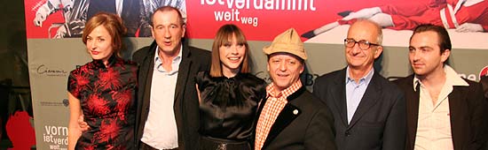 Ein muss man mal vorweg zu diesem Film sagen: er sollte ein Muß in der Vorweihnachtszeit für den Münchner Kinogänger werden, wenn er denn ab dem 13.12.2007 endlich in die hiesigen Kinos kommt. Ganz überzeugend kommt der Film rüber, keine Plattitüden, und dies liegt auch und vor allem an den überzeugenden Darstellern des Filmes, der zudem produktionstechnisch gut gelungen ist, selbst das Licht bei Innen- und Außenaufnahmen ist endlich mal richtig gesetzt. Nach zahlreichen Bühnen- und TV-Auftritten kann man nun Frank-Markus Barwasser alias Erwin Pelzig erstmals auf der großen Leinwand bewundern. Vorne ist verdammt weit weg heißt der Spielfilm, den Thomas Heinemann in Szene gesetzt hat. Das von Heinemann und Barwasser gemeinsam verfasste Drehbuch ist keine Aneinanderreihung bewährter Bühnengags des Kabarettisten, sondern erzählt eine Geschichte, die unwahrscheinlich, aber nicht unmöglich ist und in den aberwitzigsten Momenten durch das Handeln von Erwin Pelzig höchste Plausibilität erhält. "Ich mußte Pelzig treubleiben und trotzdem ein bißchen anders spielen." meint dazu Frank-Marius Barwasser. Film ab: Premiere "Vorne ist verdammt weit weg" im mathäser Kino am 3.12.2007 Und das hat sich sichtlich gelohnt, denn so, wie der Pelzig dargestellt ist in seinem verzweifelten Widerstand gegen eine Entwicklung, die scheinbar nicht aufzuhalten ist, bietet er auch auf der großen Leinwand beste Unterhaltung. Wenngleich dem Zuseher manchmal auch das Lachen im Halse steckenbleiben kann. Denn einige der Weisheiten, die ein Pelzig nun einmal die Umwelt reflektierend ungefragt von sich gibt, sind nun einmal tatsächlich weise dahergesagt. "Niemals aufgeben" - das ist das Prinzip Pelzig. Pläne für weiter kinofüllende Spielfilme hat Frank-Markus Barwasser aktuell nicht, Pelzig 2 ist noch nicht in Sicht, wäre aber, wenn man diesen Film gesehen hat, bei einem adäquaten Drehbuch wünschenswert. "Pelzig trifft den Nerv der Zeit. Ein Film für alle Menschen ab 30, diemal hinter die Fassade von alldem gucken und sich auf höherem Niveau amüsieren wollen", empfiehlt Christiane Paul den Film. Die Premiere von "Vorne ist verdammt weit weg" fand u.a. in Anwesenheit von Frank-Markus Barwasser (www.pelzig.de), Philipp Sonntag, Christiane Paul (www.christianepaul.de), Franziska Schlattner, Martin Maria Eschenbach, Peter Lohmeyer und dem Regisseur Thomas Heinemann am 3.12.2007 um 19.00 Uhr im Münchner Mathäser Filmpalast statt. Mit dabei auf dem rot-weiß karierten (!) Teppich Gisela Schneeberger, Kabarettistin und Schauspielerin Luise Kinseher (spielt im Film "die Nette" Polizistin", www.luise-kinseher.de), Maximilian Reeg (spielt den "pampigen" Polizisten, www.maxreeg.de), Dr. Klaus Schaefer (FFF Bayern), Bayerns Landesvorsitzenden der SPD, Franz Mageth, ("Sturm der Liebe"-) Schauspielerin Caroline Beil (www.caroline-beil.de) und, attraktiv in Weihnachtsrot verpackt: Starlet Davorka Tovilo, die ein wahres Blitzlichtgewitter hervorrief.