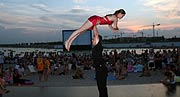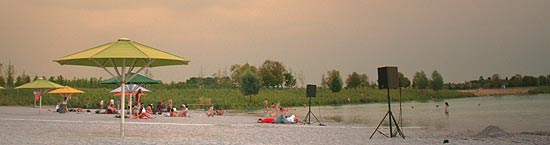 Nach der erfolgreichen Premiere des HVB Kino Open Air Festival auf dem Gelände der BUGA 2005 schwimmt auch in diesem Jahr wieder eine Kinoleinwand im See. Gezeigt werden Filmhits der 80er wie Dirty Dancing, Zurück in die Zukunft und Cocktail, die vom Schlauchboot auf dem See, auf der Hängematte oder dem Liegestuhl am Strand erlebt werden können. Vor den Filmen sorgt ein 80er Jahre DJ für Stimmung am Strand. Die Gäste werden auf der HVB Beachparty mit Cocktails und Essen sowie kostenlosen Massagen verwöhnt. Sportbegeisterte zeigen Ihr Können beim Beachvolleyball oder auf dem Surfsimulator Dieser Simulator simuliert Ihnen das Gefühl vom Wellenreiten an jedem beliebigen Ort. Es gibt fest programmierte, computergesteuerte Schwierigkeitsstufen, durch die gleiche Bedingungen bei Wettbewerben entstehen, oder es besteht die Möglichkeit das Gerät manuell zu steuern. Ein Spaß für alle Altersstufen. Doch selbst absolute Surfprofis schauen sich hier um, wie schwer es sein kann, sich auf dem Brett zu halten! (Surfsimulator von www.1st-dream.de) Stelzenläufer im Filmoutfit und Feuerschlucker geben einen Vorgeschmack auf die Filme. Schlauchboote können sie ausleihen, in einem großen Zelt stehen um die 100 der Boote zur Verfügung, die sich dann zu Filmbeginn schön vor der Leinwand im Wasser aufreihen und optimalen Genuß versprechen. Mit Hamburgern und anderen Sachen können Sie sich an einem Essensstand eindecken, Bier, Radler und diverse Cocktails gibt es an einem Getränkestand, allerdings kein Cola oder Limo. Tipp: am besten parallel anstellen, vor dem Film können die Schlangen hier recht lang werden. Oder sie bringen selbst Getränke mit. Am besten in Kunststoffflaschen, da geht wenigstens nichts entzwei. Alternativ dazu gehen sie zum Kiosk am See, der vom Biergarten am Viktualienmarkt Wirt Hochreiter betrieben wird. Hier gibt es auch z.B. einfach nur Fanta oder Cola, Currywurst mit Pommes, Schnitzel bzw. einfach nur eine Tüte Pommes auf die Hand, und die Schlangen sind kürzer. Hier im Gebäude befinden sich auch einige ordentliche und gepflegte Toiletten (Trinkgeld für die Toilettenfrau nicht vergessen). Das Vorprogramm beginnt jeden Abend ab 20 Uhr, natürlich passend zum Film. Zum Auftakt am Samstag, 22.07.2006, wurde passend zu Dirty Dancing Mambo getanzt und beim Melonenparcours Schlüsselszenen nachgespielt. Der Hufeisen-Weitwurf-Wettbewerb findet parallel statt. Höhepunkt ist der Hebefigurenwettbewerb im See. Das Ganze wurde natürlich zuvor schon unter Anleitung geübt, wie man auch die Mamboschritte von Claudio Luis Pacheco Torres erlernen konnte, einem augebildeten Populär- und Dolkloretänzer, Sänger und Percussionisten aus Havanna, Kuba, der in München in verschiedenen Studios (u.a. Café Castro, Kellerstr. 32, 81667 München) Kurse gibt (www.agua-havana.de). Rund 2.000 Besucher kamen bereits zum Auftaktfilm Dirty Dancing am 22.07.2006. Eine erhebliche Steigerung gegenüber dem Vorjahr, als mit rund 500 Besuchern am Spitzentag deutlich weniger Pubikum an den seinerzeit noch inenrhalb des buga-Geländes gelegenen See gelockt werden könnten. Am Abend des Films Zurück in die Zukunft (Sonntag, 23.07.2006) ist der Titel Programm. Bringen Sie Fotos der Eltern mit und erscheinen sie dann im gleichen Outfit. Das beste Outfit wird prämiert. Der Film selbst wird mit passenden Special Effekts richtig in Szene gesetzt. Zum Film Cocktail (Montag, 24.07.2006) werden Hawaiiketten verteilt und kleine Partyinseln auf dem Wasser schwimmen. Ein Showbarkeeper sorgt für Stimmung und animiert unsere Gäste zum Mitmachen. Als besonderer Ehrengast erwartet sie Tom Cruise selbst (nun ja, zumindest ein Double). Umesetzt hat die Veranstaltung die Münchenr Eventagentur G.R.A.L. (steht übrigens für "Gründliche Realisierung Allgemeiner Lebensfreude"), die am dem 25.07. selbst auf dem Königsplatz das dortige Open-Air Kino betreiben und hier am See schon einmal ein bißchen Promotion für sich machen durften. Programm: Vorprogramm ab 20 Uhr Wo? |