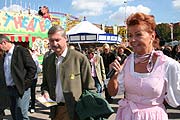 Punkt zwei auf dem Rundgang war ein Abstecher in das funkelnagelneu „Café Kaiserschmarrn“ der Münchner Firma Rischart, welches sicherlich eines der optischen Highlights der Wiesn wird. Im Alice im Wunderland Style mit Zuckerguß und fahnenbestückten Türmchen, goldgelber, Zuckerguss versüßter Fassade, wo Kaffeetasse und Kanne, Kochlöffel und Schneebesen aus einer phantastischen Backstube lebendig werden, dazu Bäckerdirndl und Bäckerbub, die in eigens für das neue Wiesn-Café entworfenen Trachten bedienen. "Gewöhnungsbedürftig", so der knappe Kommentar von Christian Ude. Der Weg zwischen dem Café Kaiserschmarrn und dem Löwenbräuzelt ist breiter geworden, von 6 auf 8 m wurde der Fluchtweg verbreitert, und auch gleich der Prototyp einer neue Toilettenanlage vorgestellt, zu der analog in den nächsten 4 Jahren weitere Anlagen entstehen werden. Die neuen WC Häuser stehen senkrecht zur Straße und bilden einen übersichtlichen Zugangshof für Frauen und Männer. Den Himmel der Holzrahmenkonstruktion bildet eine weiße Zeltplane, durch die Tageslicht wie im Bierzelt in das Innere fällt. Das Farbkonzept bruht auf den Farben des Münchner Kindls: schwarz und gelb. Die von Otl Aicher für die Olympischen Spiele 1972 Symbole wurden von Architekt Andreas Holzapfel (www.uns-architektur.de) auf Lebensgröße gebracht und klären, welcher Eingang für wen gedacht ist. Weiter ging es zum Familien Platz, wo gleich zwei Attraktionen zum kennenlernen auf dem Plan standen: der „Hammerschlag“, einem Hau-den-Lukas, den Manfred Georg Zehle nach eigener Idee entwickelt hat, ist der etwas andere Schlaghammer, dessen Wiesn-Premiere zugleich Weltpremiere ist. Er garantiert ultimativen Fahrspaß durch individuelle Schlagkraft, bietet hohen Gaudifaktor und sportliche Herausforderung. Muskelkraft führt den Hammerschlag, der je nach Wucht die Person auf dem Fahrsitz eines Turms bis zu maximal sieben Meter in die Höhe schießen kann. Was denn Oberbürgermeister Christian Ude gleich einmal zum Gaudi der Presse an Kollegin Strobl ausprobieren durfte. Weil es für die Fotos so schön war, gleich mehrere Male. Tourismuschefin Weishäupl hingeben durfte sich an ihre Kindheit erinnert fühlen, als es weiter zum „Pemperlprater“ ging, dem jüngst restaurierten ältesten Karussel auf der Wiesn, das hier Premiere feierte. Als Kind in den 50er Jahren hatte sie auch immer mit nach außen gestreckten Armen auf den holzgeschnitzten Pferde ihre Kreise gezogen. Nur hatte ihr niemand erklärt, dass man mit dem am Sattel angebrachte kleinen Spieß nach Ringen angeln konnte, die an einem draußen stehenden silbernen Fisch befestigt waren. Wer den Ring traf und halten konnte, wurde mit einer Freifahrt belohnt. Heuer ist sie natürlich fitter und schaffte im Rahmen ihrer Vorführrunden gleich 5x den Ringstich. Tradition und Moderne verbindet der nagelneue 4-Säulen-Scooter von Heiner Distel, der als nächstes besichtigt wurde, und als modernster und technisch aufwändigster Autoscooter Europas gilt. Gleich vis à vis, noch mit Belastungssäcken für die TÜV Prüfung auf allen 48 Sitzen, der Star Flyer 48 von Alexander Goetzke, der mit jetzt 24 statt 12 Auslegern als Wiesn-Neuheit große Aufmerksamkeit erregen wird. Auch eine neue Schiffschaukel gibt es endlich auf der Wiesn: bis zu 15 Meter hoch schwingt die überdimensional große Schiffschaukel der Gaudi Schaukel, deren Gondel mit bis zu 40 Fahrgästen besetzt werden kann. Die Riesenschaukel der Gebrüder Bügler kommt in bajuwarischem Habitus daher: Bayerische Alpenlandschaft mit folkloristischen Szenen, die aufgemalte Frauenkirche, Krinoline und Riesenrad zieren die Rückwand, weiße Masten mit blauen Rauten und die Holzhüttn als Kassa. Den Abschluss ging es in die Schottenhamel Festhalle, der in diesem Jahr zum 140. Geburtstag eine komplett neue Bestuhlung von der Brauerei gespendet bekam. Unabhängig davon erinnert sich Christan Schottenhamel daran, dass er nun auch seit 20 Jahren Wiesnwirt zusammen mit Peter Schottenhamel ist. Wenngleich er noch amüsiert daran denkt, dass ihre erste gemeinsame Zulassung an „Peter und Christiane Schottenhamel“ adressiert war. Dann wurden sie vorgestellt: "Die schönsten Wiesnhits" - ein Buch als Hommage an die Wiesn-Hits anlässlich der 140-Jahr Feier der Familie Schottenhamel auf dem Oktoberfest mit den vollständigen Noten und Harmonien sowie Texten der 125 schönsten Wiesn-Lieder ermöglicht allen Musikfreunden die beliebtesten und bekanntesten Wiesn Hits daheim selbst nachzuspielen. Karl-Heinz Knoll, Geschäftsführer der Spaten-Franziskaner Bräu Gmbh, umriss die aufwändige Vorarbeit zum nun fertigen Buch "Wir haben bereits kurz nach der Wiesn 2006 angefangen, Lieder zusammenzutragen, um diese Sammlung zum 140 Jubiläum der Familie Schttenhamel auf der Wiesn fertig stellen zu können." Das über 320 Seitenstarke Buch ist für 24,80 € im deutschsprachigen Musikfachhandel (und im Schottenhamel Zelt) erhältlich. “O’zapft is!” Mit dem traditionellen Fassanstich des Münchner Oberbürgermeisters Christian Ude eröffnet dann am Samstag, 22. September 2007, 12.00 Uhr das Oktoberfest. Wir sind für Sie in der Anstichbox dabei wie schon im Vorjahr (mehr), und auch die Rubrik "Wahrlich..." berichtet (mehr) (Rückblick: Fotos und Bericht aus 2004 und 2005)