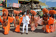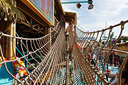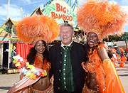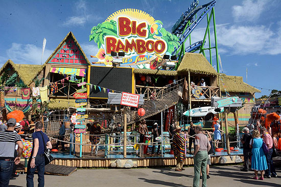 Zum Auftakt und Wiesnrundgang mit Oberbürgermeister Dieter Reiter und Wiesnchef Josef Schmid zwei Tage vor Wiesnbeginn 2014 hatte man gleich alles aufgefahren, was man so zu sehen bekommen kann: Sambatruppe, Mariachi spielende "Mexikaner" und knackige Trommler - die ganz offenbar aus der Karibik stammen könnten oder Südamerika. Viel Haut, was zum Schild passt "No Shoes!, No T-Shirt! No Problem!". Karibische Klänge, Jamaika Reggae und kubanischer Salsa mit dem DJ Maraca tragen zum Aloha-Flair bei. Geschulte Animateure betreuen die Gäste, laden zur Polonaise am Strand oder zum Limbo an der Tiki-Bar ein und unterhalten in Live-Shows von Mambo Fever bis Harlem Shake. Zu sehen war das Unterhaltungsgeschäft - das die Erlebniswelt Urlaub so schön thematisiert - z.B. schon 2012 in Straubing auf dem Gäubodenfest, auf dem Rosenheimer Herbstfest und der der Bergweih Erlangen 2012, und dieses Jahr auf dem Nürnberger Frühlingsfest 2014. Auf der Wiesn 2018 steht die weltweit einzige Anlage dieser Art Big Bamboo (Hersteller: Dietz (D) Typ: Laufgeschäft Baujahr: 2011, gestaltet vom Künstleratelier Mike Tegen ) jetzt nun zum 3. Mal „Big Bamboo“ ist mit umweltfreundlicher LED-Beleuchtung, Sturmturbinen, Wasserfontänen, Seifenblasenmaschinen, Lasershow und weiteren interaktiven Aktionsmöglichkeiten und Spezialeffekten ausgestattet. Zu finden ist das Big Bamboo 2019 in der Straße E