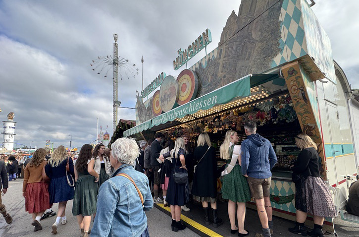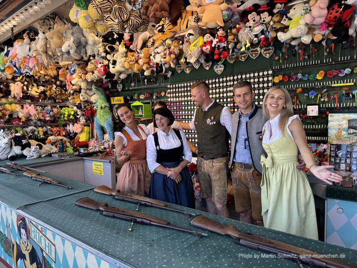Taktisch gut gelegen gleich rechts vom Käfer, ist der Schiesstand München von Gaby Büchl (ansonsten mit "Gabys Leckereien" unterwegs) und dem leider im Herbst kurz vor der Wiesn 2022 verstorbenen Ali Bräu auf dem Oktoberfest seit rund 30 Jahren erste Anlaufstelle für die Promis, die dort und auch gegenüber im Schützenzelt ein und aus gehen. Inzwischen ist die nächste Generation mit dabei, Sohn Ferdinand Büchl führt jetzt gemeinsam mit Gaby Büchl auf der Wiesn 2025 den Schießstand München