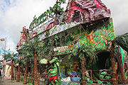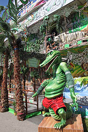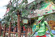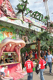 Das „Amazonas“ ist für Groß und Klein gedacht, niemand wird hier erschreckt. Nicht umsonst steht das „Amazonas“ auf dem „Familienplatzl“ und ist damit für alle Altersgruppen geeignet. Kinder ab 6 Jahren dürfen alleine rein, jüngere Kids nur in Begleitung von Erwachsenen. „Unser Anliegen ist es, den Spaß mit Wissenswertem über die Tierwelt zu verbinden“, erklärt Miriam Blume. So finden sich an den Terrarien Hinweisschilder mit den wichtigsten Informationen zu Gecko & Co. Und wenn man sich auf Abenteuertour durch den Dschungel begibt und wie Indiana Jones über Hängebrücken und Rüttelböden - vorbei an Affen und Krokodilen - den Tropenwald durchquert, dann sollte man immer aufpassen, wohin man tritt! Wir befinden uns schließlich im Mündungsgebiet des Amazonas, da gibt es Wasser - aber zum Glück auch Steine, über die wir trockenen Fußes weiter gehen können. Doch aufgepasst: Nur wer genau zuhört, kommt ohne Probleme durch den Wasserfall.... Viele Ideen und Liebe zum Detail stecken im „Amazonas“. Am besten geht man mindestens zweimal rein, um alle Einzelheiten im Blätterdickicht zu entdecken. Besonders witzig sind das sprechende Krokodil in kessen roten Shorts vor dem Eingang und das Kassenhäuschen, das im Maul eines Nilpferds untergebracht ist. Übrigens: Dass es den „Amazonas“-Tieren gut geht, ist für die Betreiber selbstverständlich. Außerdem kontrolliert das Veterinäramt die artgerechte Haltung. Wichtig für Angelo Agtsch, der in vierter Generation die Tradition der Schaustellerfamilie fortführt, ist auch die Umweltfreundlichkeit seines Laufgeschäfts. Amazonas, mit Öko-Farben lackiert und beleuchtet durch Energiesparlampen und LED-Technik, benötigt nur zwei Transporte, die mit Bio-Diesel und auf Gasreifen fahren. Selbstverständlich wird das Geschäft mit Öko-Strom betrieben. Der Standort auf der Wiesn 2017: Hinweis: 2018 kommt die Familie mit einem neuen Laufgeschäft aufs Oktoberfest: "Dschungelcamp" ist ein neues Laufgeschäft von Agtsch, das eine Fortentwicklung des Amazonas ist Für wen: Große und kleine Abenteurer Wie groß: Front: 22,50 m Tiefe: 8,50 m Höhe: 13,50 m Wieviel: Erwachsene 4 Euro, Kinder 3 Euro Zur Mittagswiesn jeweils um 0,50€ ermäßigt. Am Familientag zahlen Kinder nur 2 Euro. Hinweis: 2013 + 2014 erneut kam Angelo Agtsch mit einer Looping Achterbahn: Cobra Lost Kingdom Coaster heißt das innovative Fahrgeschäft.