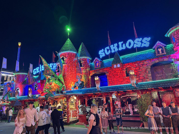 1990 wurde dann Mc. Murphy vorgestellt - die erste direkt sprechende Figur die mit dem Publikum kommunizieren konnte. Mc. Murphy hatte an dem rechten Finger einen Käfig hängen, in dem ein kleines Männlein eingeschlossen war, das im Dialog mit Mc. Murphy gesprochen hat. Ab und zu sperrte Mc. Murphy auch normale Menschen in den Käfig um sie über das Publikum zu heben (siehe Presse). Seit ihrem Umbau 1996 heißt die Geisterbahn "Geisterschloss". 1998 kamen im Inneren Spiegeleffekte, Wasserspiele und Digital Ton zum Einsatz, seit einigen Jahren wurden wieder lebende Geister zum Gruselvergnügen der Fahrgäste engagiert, ganz neue Geisterbahnwagen kommen zum Einsatz.... Dabei sei hervorgehoben, dass hier manche der Geister in der Vergangenheit direkt aus dem Nationaltheater weg speziell für die Wiesn engagiert wurden, tief drinnen in der Geisterbahn hat man dann original transilvanische "Geister" im Einsatz. Der Chef-Geist im Inneren wohnte im Zivilleben nur 8 km von Draculas Schloß entfernt... Wenn der nicht gruseln kann.... Der Standort auf der Wiesn 2025: Im Internet finden Sie die Schlossgeister im Geisterschloss von Irene Kunz unter www.geisterschloss.com Außerdem gibt es einen Online Shop www.horrorfactory.de