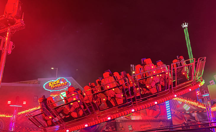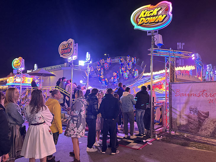 Der Kickdown Ein Adrenalinkick kehrt 2025 auf das Oktoberfest zurück (Maik Landwehrmann)Das Oktoberfest 2025 wird erneut Schauplatz für den Kickdown des Schaustellers Maik Landwehrmann sein, eine Attraktion, die für Adrenalin-Junkies und Nervenkitzel-Suchende unverzichtbar ist. Seine wiederkehrende Präsenz auf der Theresienwiese unterstreicht seine Beliebtheit als Highlight für alle, die intensive Erlebnisse suchen. Das Herzstück des Nervenkitzels: Einzigartige Bewegung und Intensität Die Faszination des Kickdown liegt in seinem komplexen Drei-Bewegungs-System: Ein rotierender Arm treibt eine gegenläufige Plattform an, auf der fünf freischwingende Gondeln jeweils vier Fahrgäste aufnehmen.