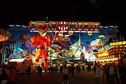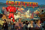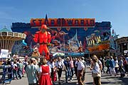 Das Star World gehört zu den voluminöseren Fahrgeschäften auf der diesjährigen Wiesn. Mit 50 Meter Länge, einer Tiefe von 26,5 Meter und einer ebensolche Höhe ist das Star World des Schaustellers Klaus Ronaldi jr. die größte Indoor-Schienenbahn der Welt. Die Erfahrungen der letzten Jahre haben bewiesen, INDOOR IST IN. Star World ist das vollkommene Ergebnis der neuen Show-Generation. Attraktionen, Abenteuer, Geschwindigkeit und das Erlebnis einer Reise durch das dunkle Reich des Weltalls bilden die Formel für das neue und einzigartige Fahrgeschäft - Star World. Die Anlage erfreut sich größten Medien-Interesses und erhielt zahlreiche Berichte in TV & Radio. Die größte reisende Indoorbahn der Welt führt den Besucher in rasanten Fahrten durch eine gigantische Weltraumstation. Sich drehende Spezialzüge rasen wie Raumgleiter geräuschlos durch das All. Fliehkraft und Geschwindigkeit als ultimatives Fahrerlebnis. Abenteuer pur! Durch eine laserbeleuchtete Kuppel im Inneren der Anlage geht es hinein ins Fahrvergnügen. Hier begegnen Sie Figuren aus dem All, galaktischen Lichteffekten und Musik & Sound, die Explosion eines Raumschiffes. Sie treffen auf riesige außerirdische Roboter, wie unsere alten Freunde DELTA II & P-OMEGA, die der Besucher bereits an der Fassade "voll in action" bestaunen kann Am Eingang begrüßt Sie Dark Raider, der Mastermind des Star World. 810 m lang ist die Fahrt, die mit ingesamt 3 Zügen à 15 Raumgleitern befahren wird. Als zusätzliche Attraktion lockt der gigantische sprechende Roboter namens "Galactor" vor dem Haupteingang, der die Wartezeit zu verkürzen hilft bei diesem beliebten Fahrgeschäft. Inzwischen ist er gar nicht mehr zu übersehen: feuerwehrrot steht er vor dem Haupteingang. 22 m groß ist er und wiegt 34 Tonnen! Singen kann er auch - den Galactor Song. Und auch die Fackel in seiner Hand speit Flammen, warten Sie nur mal ein paar Minuten und hören Sie ihm zu, was er der Welt so zu sagen hat. Seit der Wiesn 2007 ist die Fa. Renoldi mit einem vollkommen neuen Indoor Achterbahn geschäft vertreten: Höllenblitz - der Coaster heißt das schöne Stück Links zum Thema Fahrgeschäfte: |