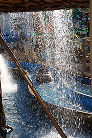 Je nachdem, wo man im Boot sitzt und auch, wie voll es beladen ist, spritzt es dort rechtheftig. Die Chancen trocken zu bleiben sind hinten größer als vorne, aber auch von der Seite schwappt bisweilen Wasser vom Rand wieder zurück ans Boot und verursacht Spritzer. Unser Tipp: wenn nur wenige Passagiere im Boot sitzen, sollte man dann sich eher hinten platzieren. Die Wagemutigeren gehen nach vorn, ineine der beiden vorderen Reihen. Für 1 € kann man an der Kasse übrigens einen Folienschutz bekommen, unter dem die Kleidung trocken bleibt. Der Gesamteindruck der Wildwasser Bahn von Meyer & Steiger stellt Fahrgäste und Festplatzbesucher nicht nur unter Erlebenszwang, sondern vermittelt im bunten Oktoberfesttreiben ein Stück Natur zum Besinnen und Verweilen. 1.000 Tonnen wiegt das Fahrgeschäft, zwei Sonderzüge der Bahn bringen das Fahrgeschäft von einem Ort zum anderen. Ein wahrhaft gigantisches Unternehmen, welches mit 700 Kubikmetern eine ganze Menge Wasser benötigt. Hier in München kommt wie alles städtische Wasser aus dem Mangfalltal und hat Trinkwasserqualität. Die Wasserpumpen sind äußerst leistungsfähig: 1.400 Liter Wasser gilt es pro Sekunde wieder nach oben zu befördern, damit der nächste Rutsch so richtig flutscht. Vor entstehenden, zum Spaß gehörenden Wasserspritzern brauchen sich weder Fahrgäste noch Zuschauer zu fürchten. Die Wasserpflege und Wasserhygiene wird mit großer Sorgfalt beachtet, so dass die eingebrachte Wassermenge für die gesamte Spieldauer einer Veranstaltung unbeschädigt erhalten bleibt. EinSpaß für Jung und Alt. Der Standort der Wildwasser Bahn von Meyer & Steiger NICHT auf der Wiesn 2019, da verkauft Die Wildwasserbahn im Internet: www.wildwasser.com