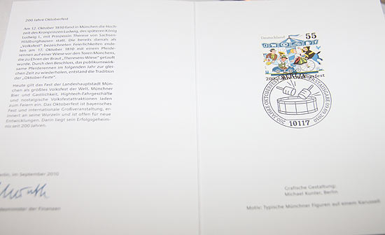 Ein kleiner Wermutstropfen ist auch dabei, stellte Ex-Wiesn-Wirtesprecher Richard Süßmeier bei einer launigen Beschriebung des Motives fest, dere in Fehlen des typischen Wiesnhendl bemäkelte. Stattdessen hatte der Künstler sich für eine Ähre neben einer Brezn, Weißwürsten, einem Ochsen, Bierkrug und Steckerlfisch entschieden. Mutmaßungen, ob die Figur im Flieger ein Hinweis auf den Oberbürgermeister Christian Ude ist, überließ er dem jeweiligen Betrachter. Gefeiert werden muss die Briefmarke auf jeden Fall. So luden die Macher des Postwertzeichens Presse, Philantelisten und Interessierte am 8. September 2010 ein, um im Zelt neben dem Hofbräukeller am Wiener Platz die Jubiläumsmarke offiziell vorzustellen und Erstdrucke an ausgewählte Personen zu verteilen. Georg Fahrenschon, Bayerischer Staatsminister der Finanzen, Wiesnstadtrat Helmut Schmid und Ex-Wiesn-Wirtesprecher Richard Süßmeier wiesen auf die Bedeutung der Wiesn hin und ebneten den Weg für den Parlamentarischen Staatssekretär beim Bundesminister der Finanzen, den Franken Hartmut Koschyk, welcher die Marke vorstellte und anschließend ein Album mit Erstdrucken des Sonderpostwertzeichens an Wiesnchefin Dr. Gabriele Weihäupl, Klaus Brähmig, Mitglied des Deutschen Bundestags, die Hausherrn des Hofbräukellers am Wiener Platz, der Familie Steinberg, das Münchner Oktoberfestmuseum, sowie diverse Repräsentanten der Stadt übergab. Bei typisch zünftiger Brotzeit mit Weißwürsten und einem kühlen Hofbräu wurde die Briefmarke dann begutachtet, gefeiert und in allen bairischen Ehren aufgenommen. Die Auflage beträgt 7,1 Millionen Stück im Standardwert von 55 Cent. T.: Tanja Lugert