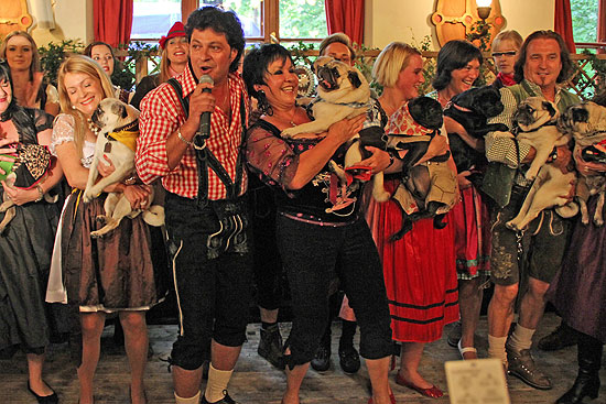 Mops Sir Henrys Wunsch ist es, dass sich einmal im Jahr möglichst viele Möpse treffen, um die Tiertafel Deutschland e.V. und das Tierheim im Tal in der Slowakei zu unterstützen. Außerdem möchte er mit dem Wiesn-warm-up darauf aufmerksam machen, dass man bereits mit einer kleinen Spende einen großen Beitrag für den Tierschutz leisten kann. Für Herrchen und Frauchen spendierte Sir Henry bayerische Schmankerl. Lebensgefährte Gerd Käfer, Lebensgefährte von Mops Henry Frauchen Uschi Ackermann, hatte ein wachsames Auge darauf, dass alle Tische gedeckt und die Gäste zufrieden waren. Freibier wurde frisch vom Faß angeapft, ein knapp gesetzter aber solider Schlag reichte Augustinerkeller Wirt Christian Vogler, "Passt scho" hieß es dann auch statt "O'zapft is". Möpse durften sich auf Leckerlis von Carnello freuen. Die Menschen auf eine neue Sorte der HARIBO Fruchtgummi-Möpse, wie immer mit dem süsse. Mopsgesicht von Sir Henry. Unter den Gästen waren zudem gleich 17 Fachtierärzt, die für Gespräche zur Verfügung standen, dabei war unter anderem TV-Tierarzt Dr. Wieland Beck, Fachtierarzt für Kleintiere und Parasitologie und Präsident der Deutschen Gesellschaft für Veterinärdermatologie. Die Garderobe der Wahl war wie schon in den Jahren zuvor die Tracht. Und dann war da noch Janis Nikos: der Tierliebhaber oder besser ein Hundenarr wie Janis Nikos (www.janisnikos.de) ließ sich nicht lange bitten, das Mops-Lied "Scharfe Möpse", einen veritablen Kandidaten für den Wiesn-Hit 2011, auf der Bühne gemeinsam mit allerlei Frauchen und deren Möpsen aufzuführen. Die langjährige Freundschaft mit den beiden Uschi Ackermann und Gerd Käfer sowie der zusätzliche gemeinnützige Gedanke, damit auch in diesem Jahr einen ordentlichen Spendenbetrag für die Tiertafel Deutschland e.V. und das Tierheim im Tal in der Slowakei zu erwirtschaften, ließen den seit 12 Jahren in München lebenden Griechen und großen Oktoberfest-Fan nicht zögern, damit musikalisch eine weitere Facette zu zeigen. Textauszug: "Scharfe Möpse geil und feurig Hier stellte man vor allem Jackets vor, deren Stoffe sich herllich kombinieren ließen und auch schön von der Haptik waren, beim angefasst werden schmeichelten sie der Hand. Der originelle Name passte gut zur Veranstaltung, wenngleich die Frauchen hier eindeutig in der Überzahl waren.