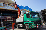 Einige Volksfeste wie das Erdinger Herbstfest, gingen am Vortag zu Ende, und schon treffen sie ein, die weiteren Fahrgeschäfte. Beim Alex Airport waren wir zufällig dabei, als gerade das große Flugzeug auf die Turmspitze per Kran gehoben wurde.