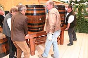 Die ersten Gäste standen schon um 7 Uhr dicht gedrängt im Frühtau vor den diversen Türen des Zeltes, jeder wohl hoffend, dass seien die Erste sei, die dann gegen 9 Uhr den Weg ins Bierparadies und zu den zu dieser Zeit noch - da nicht reservierbar - leeren Tischen im Mittelbereich zu finden. Wie junge Rehböcke hüpfen die Schottenhamel Fans im Laufschritt über die Gänge, hechten über die Bänke in den nicht reservierbaren Innenteil, manche legen sich quer über Tische - reserviert steht dann in ihren Augen und so schnell lässt man dann auch niemanden an "seinen" eben eroberten Tisch. Jubelnde Blicke derer, die es schafften, täuschte der Eindruck, oder hatte man vor allem hübschbedirndelte Mädels losgeschickt zum Freihalten. Wie dem auch sei, nun werden die Handy gezückt und den noch draussen befindlichen die Lage des Beute-Tisches erklärt. Und dann die Begrüssungszenen an den Tischen, wie man sich um den Hals fällt und busselt. Schon das allein lohnt das frühe Austehen, denn wenn man wie wir gute Fotos haben will, muss man per Sonderausweis als Presse legitimiert am Besten schon gegen 7 Uhr am Zelt sein. Dagegen füllen sich die reservierten Tische drum herum eher geruhsam, man hat ja zum Teil schon seit dutzenden oder mehr Jahren immer den gleichen Tisch, im Schottenhamel Zelt gibt es viele seit Generationen reservierte Stammtische. Mitten drin mit gutem Blick auf die Kapelle Armin Jumel, der es wieder einmal geschafft hat: seit 53 Jahren sitzt seine Familie am selben Tisch, schnell wird ein weiß-blau kariertes Tischtuch ausgebreitet, ein kleiner Maibaum auf dem Stammtisch aufgebaut, dem Jumeltisch. Gleich nebenan greifen sich Freunde und Bekannte ihre Tische. Doch vorher noch wurde um 1/2 8 Uhr ein eifrig schnüffelnder Suchhund durchs Zelt geführt, schnüffelt auch in unserer Boxe nach Verbotenem und Gefährlichem. Zwei Fässer, aus denen später angezapft werden soll, rollen gegen 1/2 11 Uhr einige kräftige Männer auf den Schanktisch, anschließend wird dekoriert, Fotos aus den Vorjahren geben Vorgaben für Platz und die rechte Optik. Angezapft wird traditionell aus dem linken der beiden Fässer, auf dem anderen sitzt später das Münchner Kindl und schaut schön in die Menge.