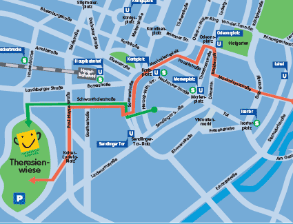 Maximiliansstraße, Residenzstraße, Ludwigstraße (Schleife südlich der Galeriestraße), Odeonsplatz, Briennerstraße, Amiraplatz Kardinal-Faulhaber-Straße Promenadeplatz Pacellistraße - , Lenbachplatz, Karlsplatz-Stachus, Sonnenstraße (Schleife in Höhe der Joseph-Spital-Straße), Schwanthalerstraße, Paul-Heyse-Straße, Georg-Hirth-Platz, Kaiser-Ludwig-Platz, Schubertstraße, Esperantoplatz (Festwiese) Einstmals im Jahre 1835 zu Ehren der Silberhochzeit von König Ludwig I und Therese von Bayern abgehalten, hat sich dieser seit 1950 regelmäßig stattfindende Trachtenfestzug zu einem herausragenden Oktoberfest-Event entwickelt, das per Fernseh-Live-Übertragung der ARD in alle Welt gesendet wird. Veranstalter dieses imposanten Festzugs, der wohl zu den größten und schönsten der Welt gerechnet werden darf, sowie der Veranstaltung "Folklore International" ist der Festring München e.V., der auch alljährlich eine Münchner Oktoberfest-Medaille in Sonderprägung und das "Festprogramm Oktoberfest" herausgibt. Die Münchner Oktoberfest-Medaille 2009 ist Anfang September über den Festring erhältlich. Medaille und Titelgraphik des Programmheftes hat Paul Ernst Rattelmüller entworfen. Es gibt insgesamt 5137 Tribünenplätze. Rund 250.000 Zuschauer säumen alljährlich den Zugweg. Sonntag, 23. September 2007, 10.00 Uhr Mit Verkehrsbehinderungen im Umfeld der Veranstaltung ist zu rechnen. Die Autofahrer werden gebeten, diesen Bereich weiträumig zu umfahren. Tribünenkarten: Weitere Infos beim - 19.09.2009: Einzug der Wiesnwirte (mehr)