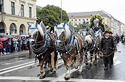 Trotz des andernden Regens säumten Tausende die Straßem, doch blieben viele Lücken auf den Tribünen und dort, wo in eiem guten Jahr dichte Mesnchenreihen standen, hier gab es die eine oder andere Lücke von Zuschauern, die häufig durch Applaus die wackeren Zugteilnehmer durch den Regen begleiteten. Alternativen waren natülich Wohnungen oder Orte wie der bayereische Hof, von wo aus man trocken (und wie im Falle Bayerischerh Hof, mit einem leckeren Wiesn-Brunch) die Teilnehmer bewundern konnte. Der Zug wird traditionell hoch zu Roß vom Münchner Kindl angeführt, in diesem Jahr erstmals Victoria Ostler. Als Ehrengäste folgten im Zug der Münchner Oberbürgermeister Dieter Reiter sowie der Bayerische Ministerpräsident Seehofer in ihrer Festkutsche. In bunter Folge wechselten sich im 7 km langen Zug festlich gekleidete Trachtler mit Sport- und Gebirgsschützen, die Münchner Schäffler, die Moriskentänzer, Musikkapellen, historischen Trachtengruppen, Spielmanns- und Fanfarenzügen und bunten Fahnenschwingern aus der Schweiz oder Italien ab. Glanzlichter des Festzuges: Zu den besonderen Höhepunkten des diesjährigen Oktoberfest Trachten- und Schützenzuges gehören neben den Münchner und bayerischen Historischen- und Trachtenerhaltungsvereinen, den Gebirgs- und Sportschützen, Blasmusikkapellen, Spielmanns- und Fanfarenzügen. Die Prachtgespanne der Münchner Brauereien, geschmückte Festkutschen und nicht zu vergessen eine Vielzahl geschmückte Festwägen mit Handwerks- und Brauchtumsdarstellungen runden das Bild dieses einzigartigen und weltberühmten Trachten- und Schützenzuges ab. Veranstalter dieses imposanten Trachtenumzugs, der wohl zu den größten der Welt gerechnet werden darf, ist der Festring München e.V., der auch alljährlich eine Münchner Oktoberfest-Medaille in Sonderprägung und das „Festprogramm Oktoberfest“ heraus gibt. Beginn mit Start des Werbevorläufers: 9:30 Uhr, ab Maximilanstraße Start des Festzuges 10:00 Uhr, ab Maximilanstraße Aufstellung des Zuges: Widenmayer-, Steinsdorf- und Sternstraße Tribünenkarten: 35.- Euro inkl. VVK (Kinder und Jugendliche 10-16 Jahren 50 % Ermäßigung) für folgende Tribünen: