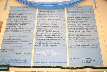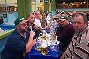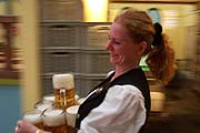 Wiesnwirt Hermann Haberl wirkt erleichtert. Mit der Hebauf feier für seine Aufbauarbeiter und Firmen ist die Spatenfesthalle, die "Ochsenbraterei", so gut wie fertig. Am Abend des 19.09.2002 wurde entsprechend gefeiert, die Tische besonders gedeckt. Sepp räumt in der 2. Reihe noch die letzten Maßkrüge ein, während die Maßkrüge eifrig aufgetragen werden. Ganz nebenbei fällt bei der Preistafel an der Wand auf: alle Preise wurden gegenüber dem Vorjahr gesenkt, um bis zu 2 Euro in einem Einzelfall sogar. Die sei hier denn auch noch einmal lobend herausgestellt.