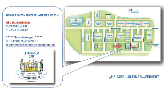 Zu finden ist das Heimer Festzelt seit 2023 in Straße 2/ Schaustellerstraße hinter dem Augustinerzelt und Bodo's. Öffnungszeiten während der Wiesn täglich 10 bis 22.30 Uhr. Speisekarte Festwirte: Heimer + Schmid OHG. Falkenstr. 23, 81541 München Reservierung: Tel.: 089 - 62 50 94 15 (Mo.-Fr 10-12 Uhr) oder reservierung@heimer-entenbraterei Zeltbüro: 089 / 500 773 90 Internet: www.heimer-entenbraterei.de Brauerei: Paulaner Sitzplätze gesamt: 400 im Zelt Musik/Kapelle: Preise (2023): Wiesnmaß Helles: 13,90 Euro incl. Bedienungsgeld, 1 Liter Weißbier 15,80 Euro, es gibt hier auch Weißbier im 0,5 Liter Glas! weitere Preise: 1/2 Hendl im Zelt: .... Euro / im Straßenverkauf ..... Euro andere Schmankerl: Hendlleber geröstet mit Reis ... Euro Andere Aktivitäten der Wirte: Wintergarten am Elisabethplatz