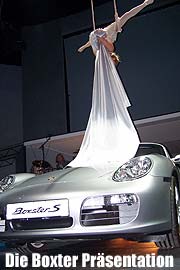 Der neue Porsche Boxster feierte in München in einem außergewöhnlichen Rahmen seine Premiere. Ende November 2004 fanden zwei Premieren statt, die wirklich echte Maßstäbe in ihrem Bereich setzen. Zum einen präsentiert Tollwood sein neues artistisches Varieté mit der Mozart-Band, zum anderen geht der Sportwagen unter den Roadstern der neue Porsche Boxster am 26. November 2004 an den Start. Was lag also näher, als diese beiden Highlights wirkungsvoll zu kombinieren. Und so traffen sich rund 1200 Porsche-Enthusiasten am Freitag, dem 26. November 2004 im großen Amadeon-Zelt auf der Theresienwiese. Das Spektakel wird von Starregisseur Alvaro Solar in Szene gesetzt. Mit dabei sind Jongleure, Magier und Trapezkünstler, die auf den Show- und Zirkusbühnen der Welt zuhause sind. Die Mozart-Band, die bereits 2003 bei der „Gaukler-Sonate“ mit dabei war, fand auch heuer wieder unter der Leitung von Wolfgang Staribacher den richtigen Ton. Neben diesen artistischen Höhepunkten stand natürlich der neueste Sportwagen von Porsche im Mittelpunkt des Geschehens. Der neue Boxster und der Boxster S zogen bereits bei der Premiere die Fans der Zuffenhausener Nobelmarke in ihren Bann. Unter dem Slogan „Wo Sport beginnt“ setzt der neue Roadster neue Akzente. Dies gilt nicht nur in punkto Design, sondern auch für die attraktiven Features unter der Motorhaube. Mit der Porsche-Präsentation auf dem Münchner Tollwood-Gelände trafen sich High Performance und Pure Driving. Was will man mehr. Eine ausführliche Fotogalerie mit kleinen Bildern zum vergrößern zeigt, wer alles gesehen wurde bei Porsche... , Teil 1, Teil 2, Teil 3, Teil 4 Der Rest von uns kann dann ab 27.11.2004 den Porsche Boxter in den Porsche Zentren begutachten. Oder bei uns nachlesen, was am Premierenabend die Gäste dazu meinten. Unser Rubrik "Wahrlich..." erzählt von der Premiere aus Sicht der Frau (mehr)