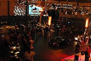 Gleich zu Beginn trat die Vertikalseilartistin "La Spina" auf - atemberaubend, poetisch, und erotisch zugleich. Mit Grazie und Leichtigkeit beherrscht sie ihrInstrument: Zwei Stoffbahnen, an denen sie hinauf- und heruntergleitet, in die sie sich fallen läßt, mit denen Sie spielt und sich hineindreht. Die Band "Szenario" begeisterte zusammen mit dem Power-Geiger Christof Broll und der charismatischen Sängerin Sheila Gathright das Publikum. Das vorgestellte Fahrzeug, der 911 Targa 4 und 4S, ist nun die mittlerweile sechste Targa-Generation. Der Ur-Targa 1966 war das erste Sicherheitscabriolet der Welt mit Targabügel und einem herausnehmbaren Targadach in Form eines Schildes (Schild = italienisch "Targa"). Mit Einführung des 993 Targa im Nov. 1995 wurde dieses Schild von einer aufwändigen Glasdachkonstruktion ersetzt, die auch im Winter Cabriofeeling aufkommen läßt. In der Version 997 (aktuelle Version) ist der Targa erstmalig auch als Allrad lieferbar in der Version Targa 4 mit 325 PS und der Version 4S mit 355 PS. Beiden ist die im Vergleich zu den heckgetriebenen 911 Modellen um 44 mm breitere Karosserie gleich. Das elegante Design der Dachlinie wird durch Zierleisten aus eloxiertem und poliertem Aluminium unterstrichen. Dies unterscheidet das Targamodell von allen anderen 911ern. Peter v. Oppen