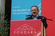Zwischen der Neuherberg- und der Schleißheimer Straße soll bis März 2008 für einen Einzugsbereich von rund 450.000 Menschen im Umkreis von 30 Fahrminuten (davon im Kerneinzugsbereich rund 124.000 Einwohner in näherer Umgebung zum mira Einkaufzentrum) das 120 Millionen Euro-Projekt mit einer Verkaufsfläche von rund 16.000 qm für bis zu 75 Mieteinheiten entstehen. 60 Prozent waren bereits bei der Grundsteinlegung vermietet. Das Einkaufszentrum wird über einen Technikfachmarkt, drei Textilhäuser, einen Lebensmittel-Discounter und einen Drogeriemarkt verfügen, ein Familienschuhhaus, Geschäfte für Haushaltswaren und Technik, Buchhandlung, Apotheke, Zeitschriftenhändler und vieles mehr ergänzen das Anngebot. Dazu kommen ergänzenden Dienstleistungsunternehmen wie Reinigungsbetriebe und Schlüsseldienst, Fotograf, Friseur usw. Ingesamt sind 88% der Flächen für Einzelhandel vorgesehen, rund 9% für Dienstleistungen und Ärzte sowie 3 Prozent für Gastronomie. Restaurants und Eiscafé liegen in den Randbereichen, so dass sie auch von außen zu erreichen sind und auch noch nach Ladenschluss als Treffpunkt des Stadtteilzentrums fungieren können. Das Untergeschoß wird direkt an den U-Bahnhof Dülferstraße angebunden, von wo aus Kunden das Gebäude unmittelbar erreichen können. -Übersicht: Geschäfte Stadtteil- und Einkaufszentrum MIRA München Nordheide (mehr) Der Standort des Einkaufszentrums Mira liegt auf einem ehemaligen Militärgelände und ist als Zentrum des neuen Stadtquartiers Nordheide mit 130.000 Einwohnern geplant. Bei der Planung wurde großer Wert auf freundliches und hochwertiges Ambiente gelegt, um dem Besucher ein umfassendes Einkaufserlebnis zu bieten. Mit seiner großzügigen und ansprechenden Innengestaltung lädt das Zentrum zum Verweilen und Flanieren ein, ist Treffpunkt und Begegnungsstätte. Außergewöhnliche Details, wie ein angelegter Teich mit 15 Meter hoher Fontäne und eine Vielzahl von individuell gestalteten Sitzmöglichkeiten und Pflanzen, tragen dazu bei, dass man sich hier gerne aufhält und rundum wohl fühlt. Auch von außen betrachtet entsteht ein markantes Objekt. Auf der Grundlage des Gebäudeentwurfs von Chapman Taylor Architekten (www.chapmantaylor.com) erhält das Zentrum eine lebendig strukturierte Fassade aus bunten und zum Teil verspiegelten Quadraten, die das Berliner Architekturbüro Léon, Wernik & Wohlhage (www.leonwohlhagewernik.de), als Sieger des ausgeschriebenen Fassadenwettbewerbs, entworfen hat (u.a. in München aktiv mit dem Hochhaus für den Süddeutschen Verlag, 2004 entstanden die markanten Feilitzschhöfe München in Schwabing, und ganz aktuell gewann das Architekturbüro im Juli 2007 mit "Tripoli Greens" den 1. Preis im Wettbewerb für Libyens neuen Regierungssitz). Je nach Blickwinkel und Bewegungsrichtung des Betrachters wechseln die Quadrate an der Fassade des mira die Farbe und reflektieren in unterschiedlicher Weise ihre Umgebung. Das neue Einkaufszentrum ist per Bus, U-Bahn und auch mit dem Auto zu erreichen. Hierfür entstehen 750 PKW-Stellplätze. Erst im Dezember 2006 war der Grundstein für das Geschäftszentrum gelegt worden, das die 6.000 Bewohner des neuen Stadtteils im Münchner Norden mit den Dingen des täglichen Bedarfs versorgen soll eine „rekordverdächtig „Dieses Projekt ist ein Riesengewinn, eine Bereicherung und Aufwertung für das Wohnquartier Nordheide”, betonte Ude beim Richtfest. „Damit erhält der neue Stadtteil nicht nur ein neues Einkaufszentrum, sondern sein überfälliges Stadtteilzentrum, seine lange vermisste urbane Mitte.” Denn neben 70 Geschäften wird „Mira” auch ein Dienstleistungszentrum mit Ärztehaus, Apotheke und Bankfiliale beherbergen sowie Restaurants und Cafés, die auch nach Ladenschluss noch für Leben im Zentrum sorgen. Intensiv diskutiert worden war im Vorfeld die Dimension des Gebäudekomplexes. Ursprünglich hatte die Stadt ein Einzelhandelszentrum mit 10.000 Quadratmeter Verkaufsfläche an der Nordheide errichten wollen. Der Investor, die Fondara Gesellschaft für Immobilienentwicklung und Projektmanagement mbH, setzte sich mit seinem Wunsch nach einer Vergrößerung des Zentrums dann aber durch, der Stadtrat änderte den Bebauungsplan entsprechend. Auf drei Ebenen errichtet die Fondara GmbH nun für 120 Millionen Euro „Das ist zwar deutlich mehr als noch im ersten Bebauungsplan vorgesehen war, liegt aber gerade mal bei der Hälfte der Riem-Arcaden und nur bei gut einem Viertel des OEZ”, relativierte Ude in seiner Rede zum Richtfest am 25.07.2007 diese Flächen-Vergrößerung. Dennoch erwarte die Kunden ein umfassendes Versorgungsangebot. Darüber hinaus biete „Mira” noch weitere Vorzüge: Das Stadtteil- und Einkaufszentrum biete 300 Menschen einen Arbeitsplatz und setze auch in Sachen Klima- und Umweltschutz Maßstäbe, da es durch innovative Haustechnik im Vergleich zu konventionell gebauten Einkaufszentren eine Energieeinsparung von etwa 40 Prozent erreiche. Beim Stadtteil- und Einkaufszentrum „Mira“ München Nordheide wird unter anderem mit Grundwasser gekühlt, die Raumlufttechnik intelligent geregelt und Wärme aus der Abluft rückgewonnen. Oberbürgermeister Christian Ude hielt am 25.07.2007 die Festrede zum Richtfest für das neue Stadtteil- und Einkaufszentrum „Mira“ München Nordheide. Klaus Herrmann und Thomas Schumacher, Geschäftsführer der Fondara Gesellschaft für Immobilienentwicklung und Projektmanagement mbH, begrüßen die Teilnehmer und Gäste. Rund 600 Gäste aus allen gesellschaftlichen Bereichen nahmen teil unter anderem Planer, Architekten und Bauleute, der Wahlkreisabgeordnete München Nord Dr. Axel Berg MdB (SPD); Johannes Singhammer (CSU); Bezirksauschussvorsitzende Antonie Thomsen (BA 11 Milbertshofen - Am Hart) und Dr. Rainer Großmann (BA 24 Feldmoching - Hasenbergl) sowie weitere BA-Mitglieder; der CSU-Fraktionsvorsitzende im Stadtrat) (und OB Kandidat der CSU) Josef Schmid, die Stadträte Diana Stachowitz