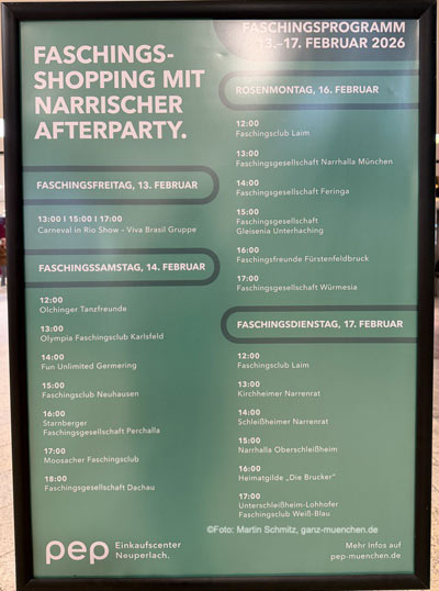 Hier finden Sie das Programm 2026 Faschingsfreitag, 13. Februar 2026 Die Viva Brasil Gruppe bringt mit ihrer „Carneval in Rio Show“ (13:00, 15:00 und 17:00 Uhr) südamerikanisches Temperament ins Center. Faschingssamstag, 14. Februar 2026 Den Auftakt machen die Olchinger Tanzfreunde (12:00 Uhr), Um 13:00 Uhr folgt der Olympia Faschingsclub Karlsfeld mit seinem Saisonmotto „Im Reich der Träume“ Fun Unlimited Germering (14:00 Uhr) präsentiert sein Showtanz-Motto „Infinity durch Raum und Zeit“ Der Faschingsclub Neuhausen (15:00 Uhr) tritt auf mit dem Motto "La Dolce Vita" Die Starnberger Faschingsgesellschaft Perchalla folgt um 16:00 Uhr... Der Moosacher Faschingsclub (17:00 Uhr) bringt sein Motto „Moda Nostra Unser Stil ist Fasching“ auf die Bühne Den Abschluss bildet der Auftritt der Faschingsgesellschaft Dachau (18:00 Uhr) Rosenmontag, 16. Februar 2026 Der Faschingsclub Laim (12:00 Uhr) eröffnet den Tag, gefolgt von der traditionsreichen Narrhalla München (13:00 Uhr), die ihre Saison unter das Motto „Beats und Berge“ stellt eine Verbindung aus bayerischer Identität und moderner Showästhetik.