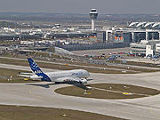 Erste Landung des Airbus A 380 am Münchner Flughafen: An- und Abflug des neuen Großraumjets auf der südlichen Start- und Landebahn am 28.03.2007 |