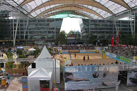 Rund 750 Tonnen feiner Sand, die für die Veranstaltung ins MAC Munich Airport Centrum geschaufelt wurden, dem Übergang zwischen Terminal 1 und Terminal 2 des Münchner Fliughafens, assen auch bei den daheim gebliebenen Urlaubsstimmung aufkommen. Seit 7.08.2009 wird am Münchner Airport wieder gebaggert, gepritscht und geschmettert: Zum Auftakt der Airport Beach Tage kämpfen in der einzigartigen Strand-Atmosphäre des München Airport Centers (MAC) die besten Beachvolleyball-Teams des Freistaates vom 07.-09.08.2009 um den bayerischen Meistertitel. Angetreten sind die besten 12 Damen-, 16 Herren- und 16 Mixedteams, die das große Finale des BVV-Beach-Cups bestreiten dürfen. Die besten Teams im Freistaat traten am Freitag ab 11.00 Uhr, am Samstag und Sonntag jeweils ab 9.00 Uhr an auf einem der drei Felder, die im MAC errichtet wurden.