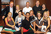 ![]() Kalari-Yoga im Hotel Larimar mit Prominenten. Vorne v.li.: Lidia Baich, Elke Winkens, Nidhin Pallikkara, Uwe Kröger, Angelika Ahrens, Nina Proll; hinten v.li.: Johann Haberl, Nikola Fechter, Christopher Wolf, Jürgen Wilke, Helene von Damm (Lar-7916) |