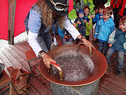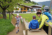 Zum Freizeitgelände gehören außerdem Themenpfade, darunter ein Hexenpfad, ein Panoramapfad und ein Barfuß-Erlebnispfad mit Erfahrungsfeld-Elementen nach Hugo Kükelhaus und Matthias Schenk, sowie ein Streichelgehege, almwirtschaftliche Vorführbetriebe und weitere Spiel- und Bewegungsmöglichkeiten. Jedes Jahr hat das Hexenwasser ein neues Thema, das in den Mittelpunkt gestellt wird, 2013 war zum Beispiel das Jahr der Bienen, die international durch Krankheiten gefährdet sind und deren Aussterben letztlich auch zu einer Katastrophe für die Menschheit führen würde, wie schon Albert Einstein 1955 recht drastisch formulierte. Hier in Hexenwasser stehen die Bienenstöcke in einem alten Gebäude - dem Haus der Bienenkönigin - im Mittelpunkt. Spielerisch kommt man beim "Söller Bienathlon" zum Thema Honigsammeln, auf die Schwänzeltänze, mit denen die kleinen Bienen so erstaunlich präzise untereinander kommunizieren, und das Gefühl, im Dunklen wie im Bienenstock, praktisch im "Stockdunklen", nur durch tasten, riechen und schmecken zurückzukommen, lässt sich auch erfahren. Übrigens: hier aus den Stöcken fliegt die "Carnika", die Kärntner Biene (Apis mellifera carnica), auch Krainer Biene genannt, die als ganz friedliche Bienenrasse gilt. Spannend auch andere betreute Stationen hier im Hexenwasser. So kann man sich selbst auch an einem Klangstein erproben, oder unter den "Hexenschirmen" die Wirkung des Klanges mit einer Wasserklangschale sogar visuell erkunden, wenn nämlich diese in feinsten Tropfen zu sprühen anfängt nur durch die Reibung der Hände an den Griffen der Schale. Dabei tanzt das Wasser, überwindet die Schwerkraft, die Tropfen springen aus dem Becken, beschreiben Muster und Formen. Beim längsten Barfußwanderweg Österreichs, den es auch hier in Hexenwasser gibt, befreit man erst einmal die Füße vom Schuhwerk. Die Füße greifen dann mit ihrer ganzen Sohle und den Zehen nach Sand, Steinen, Hölzern, Wald - und Wiesenböden... man steigt in einen Bach hinein und erlebt mit Haut und Haar die Kühle des Wassers. Ein ziemlich prickelndes Erlebnis, bei dem Füße die natürliche Stellung wiederfinden, alle Muskeln gleichmäßig bewegt werden. Die Längs- und Querwölbungen gewinnen Kraft und Halt und dies überträgt sich entspannend auf den ganzen Körper. Für die Gesundheit und die Schmerzfreiheit des Rückens und der Bandscheiben leiste das Barfußgehen einen entscheidenden Beitrag, verrät das Hexenwasser.Der "Gatschtrog" eines der absoluten Highlight für kleine Barfußentdecker. In einer BEGEHBAREN KIRSCHE (neu 2014) entdeckt man das Wunder wie aus einem steinharten Kern ein so zarter Kirschzweig wachsen kann und es wird erzählt wie die Salvenkirsche nach dem ersten Weltkrieg von Russland nach Söll kam. Der Barfussweg führt durch den bezaubernden Kirschgarten und lädt zum Verweilen ein. Im Gasthaus Salvenmoos, dem Alpengasthof Hochsöll, der Gründlalm, der urige Almhütte „Silleralm“, dem Gipfelrestaurant Gasthaus Hohe Salve und der Stöcklalm läßt sich immer wieder Rast machen mit Blick auf diverse Attraktionen, denen sich die Kinder in Sichtweite widmen können. Die Region Wilder Kaiser ist das ideale Ziel für einen Familienurlaub. Das liegt auch an den Bergerlebniswelten, besonders an Ellmi's Zauberwelt und am Hexenwasser. Kleine und große Gäste können hier viel entdecken und eine unvergessliche Zeit erleben. Seit 2020 kann man mit der neuen Hexenwasser „Erlebnis“ 10er Gondelbahn abheben. Die Gondelbahn Hohe Salve (vom Hexenwasser auf die Hohe Salve) ist im Sommer täglich von 9:00 Uhr bis 16:45 Uhr geöffnet. Das Hexenwasser ist somit von Hopfgarten über die Hohe Salve mit der Salvenbahn I und II und der Gondelbahn Hohe Salve erreichbar. Die Gasthöfe, der Barfußweg, die Wasser- und Staubecken sowie die Wanderwege im Hexenwasser waren schon teilweise vorher geöffnet. Die Gondelbahn Hexenwasser startet ab 09. Mai, die Gondelbahn Hohe Salve am 18.05.2024, Saisonende ist der 03.11.2024 Veranstaltungen @ Hexenwasser 2024