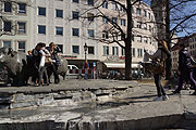 Am 09. April begann 2015 in München nun auch ganz offiziell die Brunnensaison. Schon am Vortag wurde eifrig vorbereitet, nach der Entfernung der winterlichen Holzverschalung musste der Brunnen am Rindermarkt von dem Münchner Bildhauer und Akademieprofessor Josef Henselmann aus dem Jahr 1964 zum Beispiel erst einmal teilweise entkalkt werden, so dass die dunkleren Steinplatten der terrassierten Brunnenlandschaft aus Tessiner Macchia-Gneis nun wieder zum Vorschein kamen. Dann wurde über einen Hydranten das Wasser eingelassen, über eine spezielle Kastenkonstruktion, die ein Hin- und Herschleudern des unter Druck stehenden Schlauches vom Hydranten verhindert.
