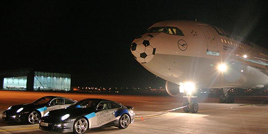 Wie immer, nur stärker, schneller, attraktiver und preislich noch ein wenig gehobener - so läßt sich wohl der neue Porsche Opus 911 beschreiben. Von 0 auf 100 sprintet er in 3,9 Sekunden - da habe ich meinem Auto gerade einmal den Gang eingelegt. Dem Turbo-Fahrer klopfte an diesem Abend das Herzchen, denn die Porsche Zentren Olympiapark und München, ließen dem neuen Sportwagen zu Ehren zwei Top-Events ausrichten. Porsche hatte in München AM 22. Juni 2006 einen besonderen Anlass zu feiern: Die Präsentation des Opus 911. Martin Lohmann (Porsche Zentrum München) und Thorsten Günther (Porsche Zentrum Olympiapark) luden Ihre Kunden und prominente Gäste an den Flughafen Terminal II („Porsche zieht Airbus auf dem Flughafen München“) und in den Blue Spa Bereich des Bayerischen Hof ( „Best things on top; Motto: White Night“). TOP1: Eine Ouvertüre aus Design, Kraft und Eleganz - unter diesem Motto erlebte die Münchner Gesellschaft auf dem grandiosen Dache des Bayerischen Hofs eine ´White Night". Ein lauwarmes Lüftchen und der rötlich leuchtende Untergang der Sonne taten ihr übriges um sich wohlig in die bequemen Lounge-Sessel des Blue-Spa Bereichs zu kuscheln. Eingebettet in weißem Design, verhüllt mit einem weißem Samt-Tuch, mitten im „Ozean“ des Blue Spa wartet ein am Nachmittag erst mit einem Riesen-Kran aufs Dach des Bayertischen Hofes gehobene Porsche Opus 911 darauf, von den erlesenen Gästen entdeckt zu werden. Sanfte Wellness-Klänge, ein excellentes Degustations-Menü (u.a. Champagnersüppchen als Vorspeise, bretonischer Seeteufelrücken als Hauptspeise), bei entspannter Chillout- und Lounge Musik, gepaart mit dem Blick auf die Frauentürme, halfen dem Gast den Spannungsmoment zu überbrücken. Die anschließende Enthüllung des "High Tech Sporttraums" wurde perfekt inszeniert und moderiert vom DSF Sportmoderator Frank Buschmann. Gekonnt locker und kompetent zelebrierte er das Spektakel. Porsche Zentrum Olympiapark Geschäftsführer Thorsten Günther zeigte sich im Gespräch auf der Bühne mächtig stolz auf das Fahrzeug und die perfekt inszenierte Veranstaltung: „Eine außergewöhnliche Location, für ein außergewöhnliches Event. Wir wollten uns von anderen Autopräsentationen abheben und etwas ganz neues schaffen.“ Als Privatmann und Autohaus-Chef hatte Günther vorab bereits die Möglichkeit, einmal den Opus 911 fahren zu dürfen: „Es ist einfach Beeindruckend, welche Leistung in diesem Auto steckt und mit welcher Leichtigkeit pure Beschleunigung erreicht wird, die auch bei Tempo 200 noch nicht an Souveränität verliert“ Beeindruckt auch vom PS-Prachtstück der sympathische Schönheitspapst Prof. Werner Mang: "Hier passt alles, das nenne ich Ästhetik". Musikproduzent Leslie Mandoki stimmt ihm zu: "der Opus 911 ist wie eine perfekte musikalische Komposition." "...einfach nur sexy..", schwärmte die schöne Heydi Nuney-Gomez. Die Wahl-Londonerin, die demnächst ein Praktikum bei Vivienne Westwood absolviert, zog wie so oft alle Blicke auf sich. Die Gäste trugen fast alle weiß und schwarz, (nur ich kam in rot....UUPPSS): TOP 2: Eine absolut Weltpremiere erlebten die Gäste, die sich zur Teilnahme bei der Präsentation des Porsche Turbo Opus 911 auf der Besucherterrasse des Münchner Flughafens entschieden hatten (darunter manche, die wohl einen fliegenden Wechsel vom Blue Spa in den Terminal II geschafft hatten). Zur Einführung des neuen Porsche Turbos ließ das Porsche Zentrum München zwei der 480 PS-Boliden einen 100-Tonnen Airbus A300-600 von 54 Metern Länge über das Rollfeld ziehen Die drei Flugzeugpiloten, die ihr Großraum-Flugzeug erst wenige Minuten zuvor aus Frankfurt eingeflogen hatten, bangten zwar, dass die Drahtseile hinter den beiden Turbos nicht rissen, aber der „Drahtseilakt“ klappte perfekt. Rennfahrer Patrik Simon, der neben Martin Lohmann (Chef Porsche-Showroom) den zweiten Porsche Turbo fuhr, scherzte: "Vor meinem letzten 24 Stunden Rennen auf dem Nürburgring habe ich ruhiger geschlafen.." Begeistert reagierte der langjährige Porschefan Kai Pflaume, in letzter Sekunde direkt vom Set eingetroffen und selbst erst seit vier Wochen Besitzer eines neuen „normalen“ Porsche 911: „Das schöne am Porsche ist, dass du damit langsam in der Stadt und schnell auf Autobahnen fahren kannst. Und beides absolut sicher und sparsam.“ Der neue Turbo, der in weniger als vier Sekunden Tempo 100 und in gerade mal 12,8 Sekunden die Marke von 200 km/h erreicht, ist nicht nur Supersportler, sondern auch Sparmeister (nur 12.8 Liter/100 km). Hier auf dem Rollfeld mussten sie nun ihre vollen Kraft auf den Boden bringen, zugleich die Finessen der Motorsteuerung ausreizen, den ein Porsche ist zwar auf allen Straßen eine "Zugmaschine", aber nicht im herkömmlichen Sinne. Wochenlang hatte man vorher geprobt, die richtige Aufhängung konstruliert, spezielle Bungee-Seile berechnet und verknüpft, während der Fahrt war man mit dem Piloten per Fubk aus beiden Autos permanent verbunden. Bei den aufwühlenden Klängen von Carl Orffs Carmina Burana fieberten u.a. der beliebte Moderator Kai Pflaume und der Schauspieler Ralf Möller mit, wie die zwei Porsches den Airbus mehrere Kilometer zur Besucherterrasse zogen, bevor es dann zu einer persönlichen Inspektion des natürlich auch hier zu besichtengende Fahrzeugs ging. "Die Atmosphäre hier am Flughafen ist einfach großartig," plauderte Sarah Kern, die mit Sohnemann erschienen war, ders ich ooptisch auch schon ins Zeug zu legen vermag, den Kamera-Heerschaaren, die seiner Mama wegen zugegen waren, sah er jedenfalls, gekonnt gelassen in die Objektive. Sarah Kerns (“Mein allererstes Auto war ein Porsche-Turbo.“ ) schwarzes Abendkleid (entworfen von Hemden-König und Ex-Mann Otto Kerns Tocher Candy Kern) erregte mit einem Ausschnitt bis zum Bauchnabel die Aufmerksamkeit der Damen. Die männlichen Blicke blieben beim Porsche hängen.... Was sagt uns das: 1. Fußball 2. Auto 3. Job und erst an d